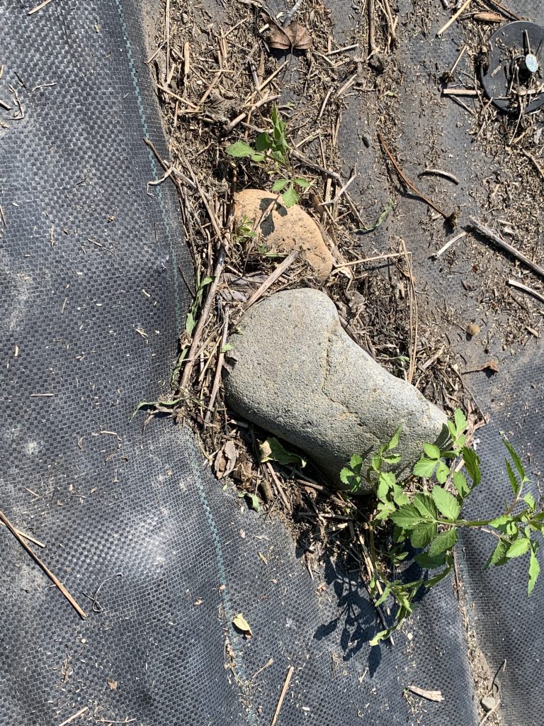 防草シートが舞わない様にお客様がところどころに石を置いてあります。