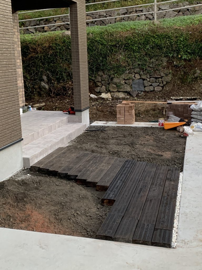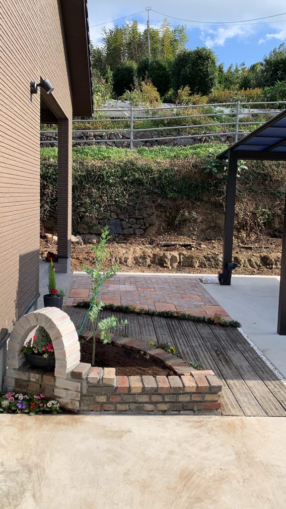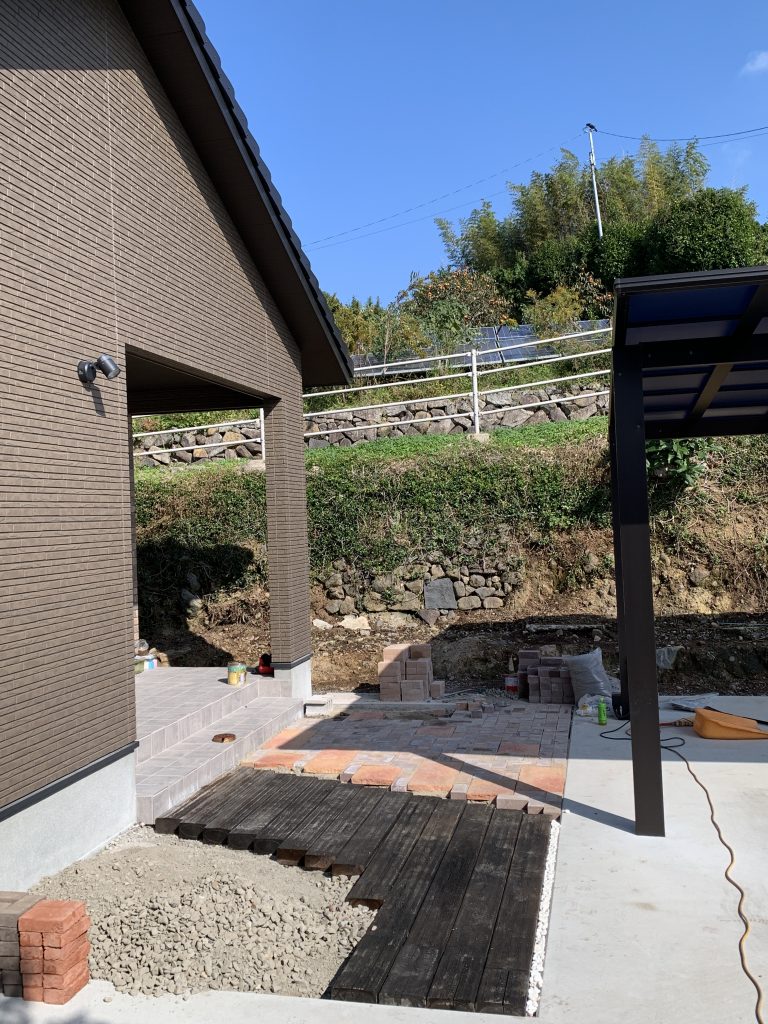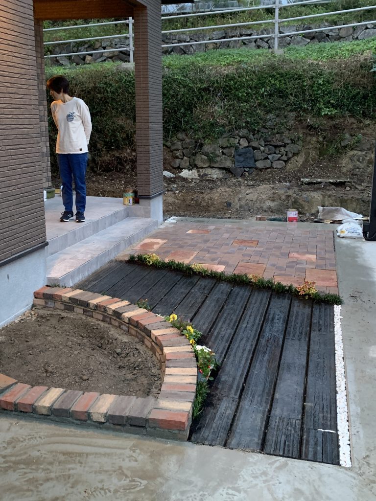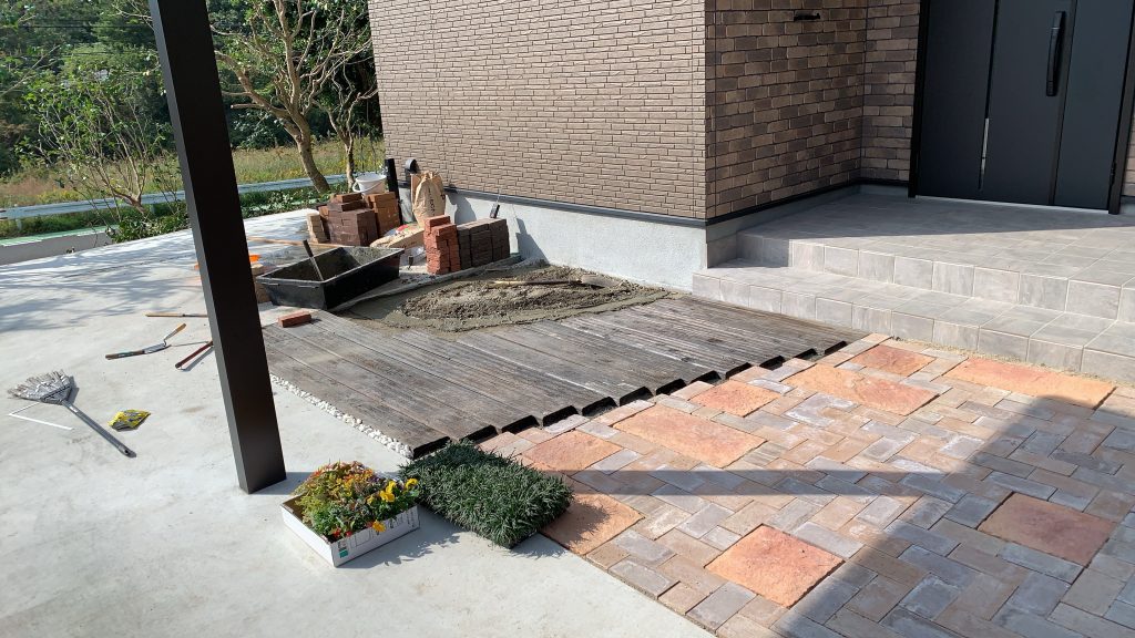 右側半分にはインターロッキングを引き詰め大型レンガも使用。